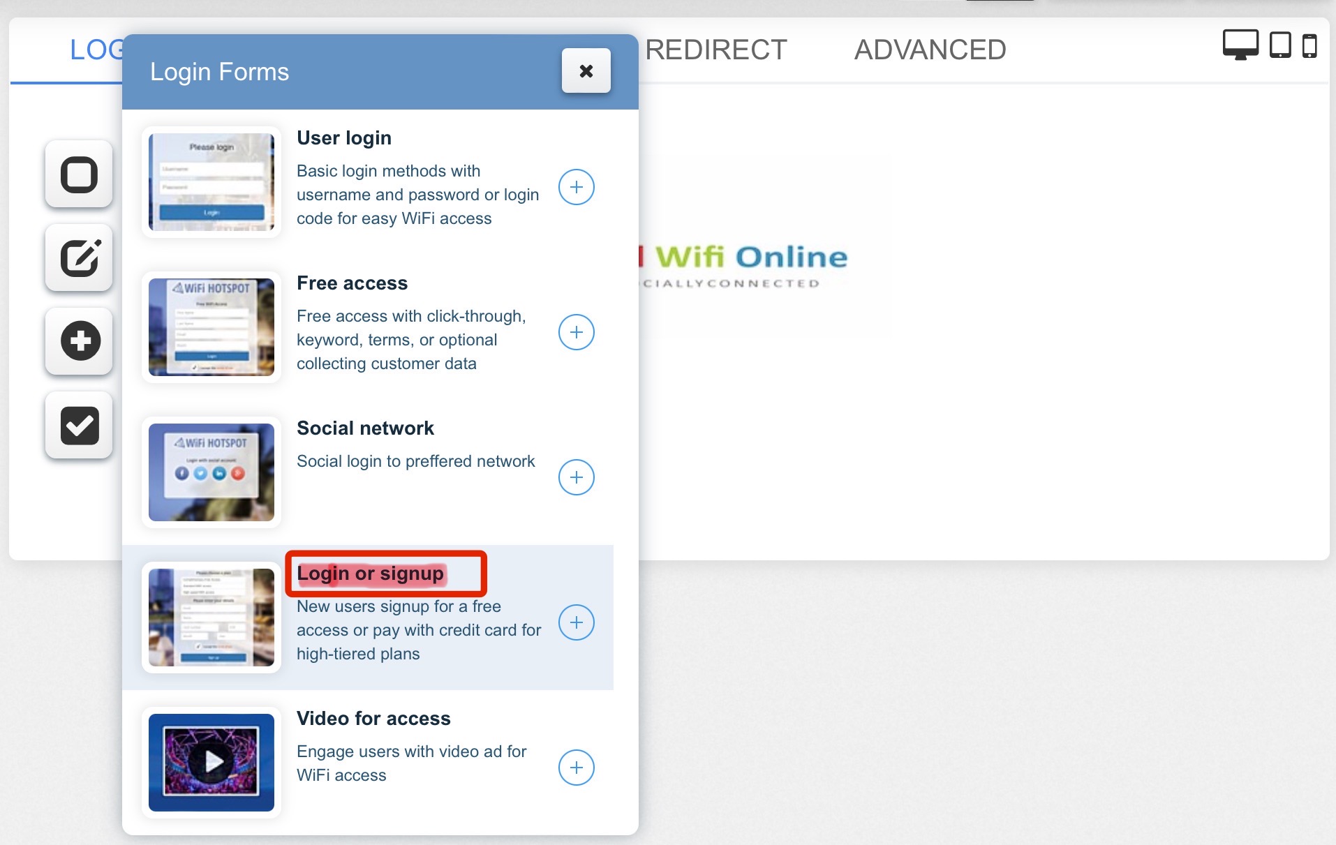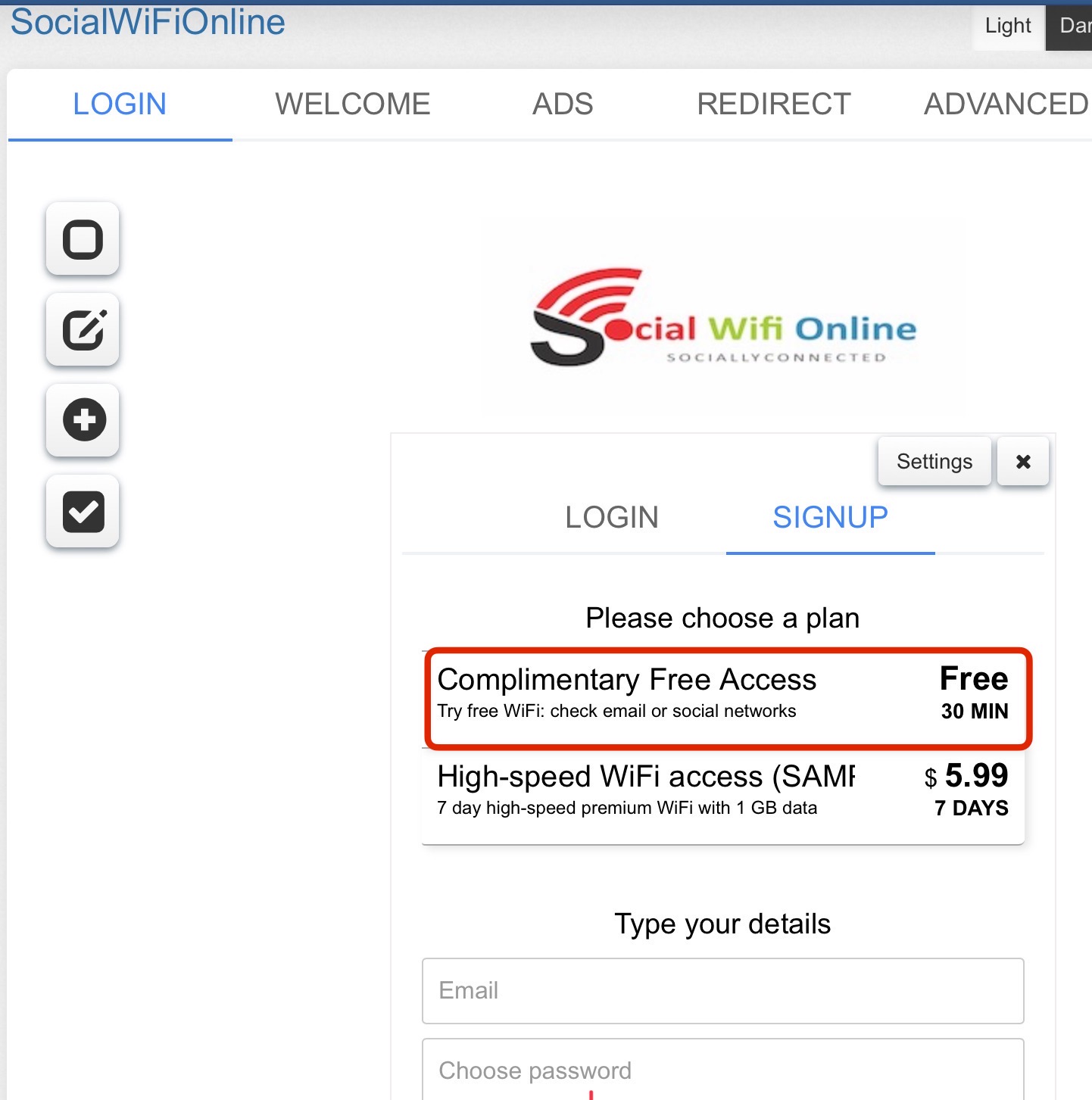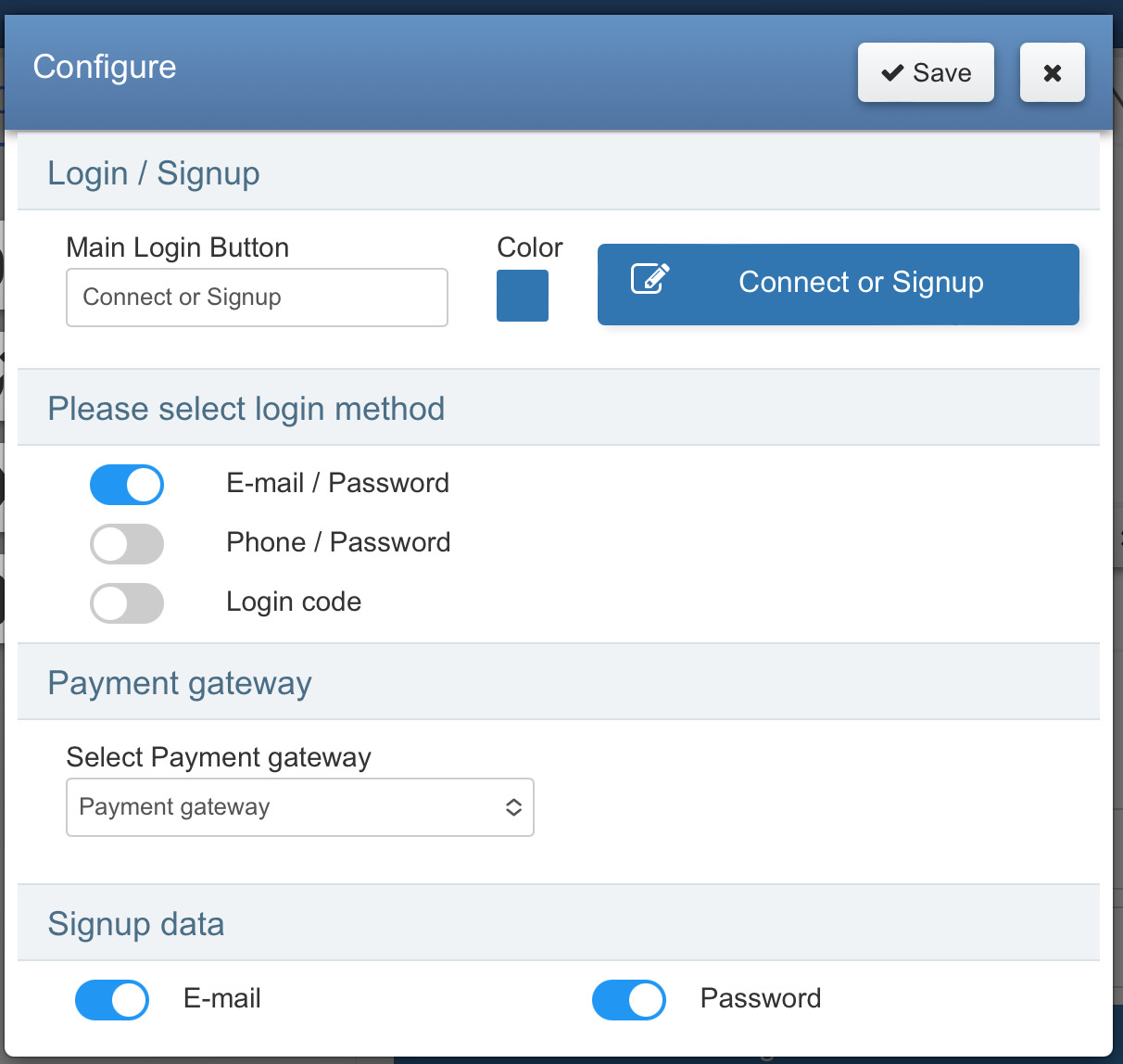 Login or signup can be configured from the Settings page configuration menu.