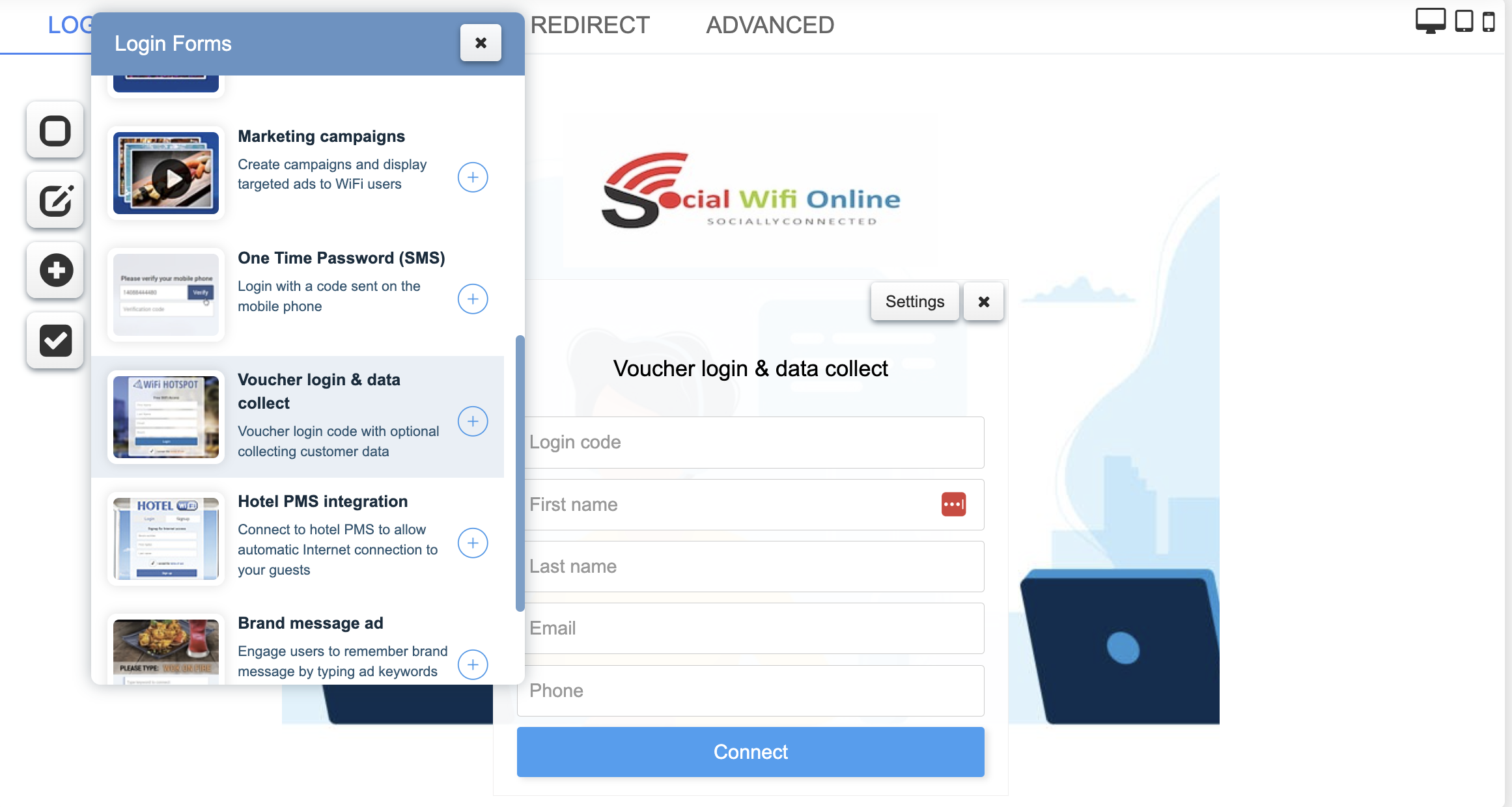 From Login forms choose Voucher login & data collect.When you click on the + button, this login form will be added as the login method.